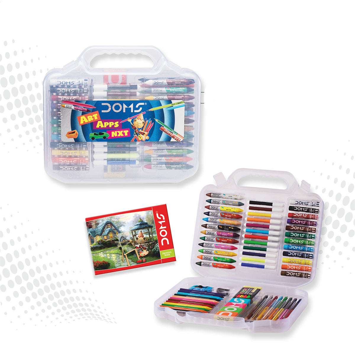 Doms Art Apps Nxt is a perfect value kit that comes in a convenient and attractive handy plastic case pack. It is a perfect kit with assorted products suitable to gift your children, their friends or students. The kit contains 12 Water Colour Pens, 24 Assorted Shades Bi-Colour Crayons, 12 Jumbo Oil Pastels, 16 Assorted Shades Bi-Colour Pencils, 12 Plastic Crayons, Neon Rubber Tipped Graphite Pencils Pack, Sports Car Eraser, Sharpener and a Drawing Book. Help your little friends paint their creative imagination on paper.