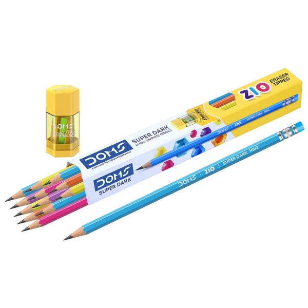 Pencils 12 N, Eraser-Sharpener 1 N •Length: 185mm each •Zio eraser tipped pencils are made with high bonding process and high-quality graphite for neat, dark and long-lasting writing • Softened wood ensures smooth sharpening and longer shelf-life meeting international quality standards